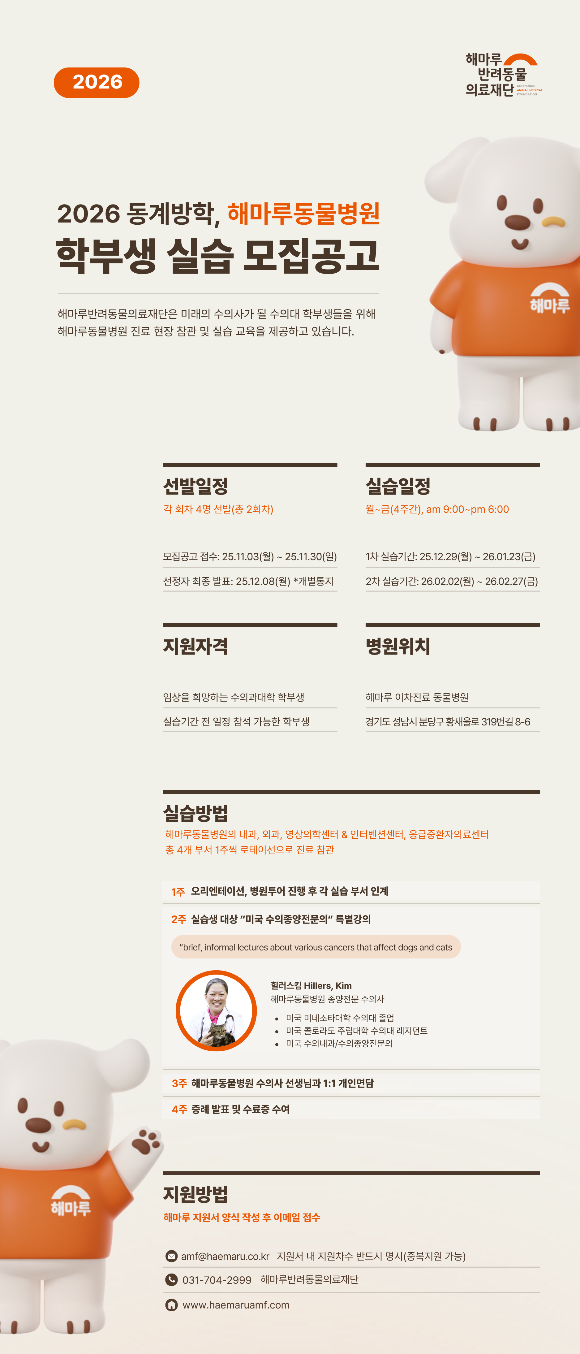 PREV [모집] 2026 해마루이차진료동물병원 응급중환자의료센터 수련의 모집 공고 NEXT [학술활동] 전성훈 인터벤션센터장,아시아·태평양 소동물수의사대회(FASAVA Congress 2025)에서 우수학술발표상 수상