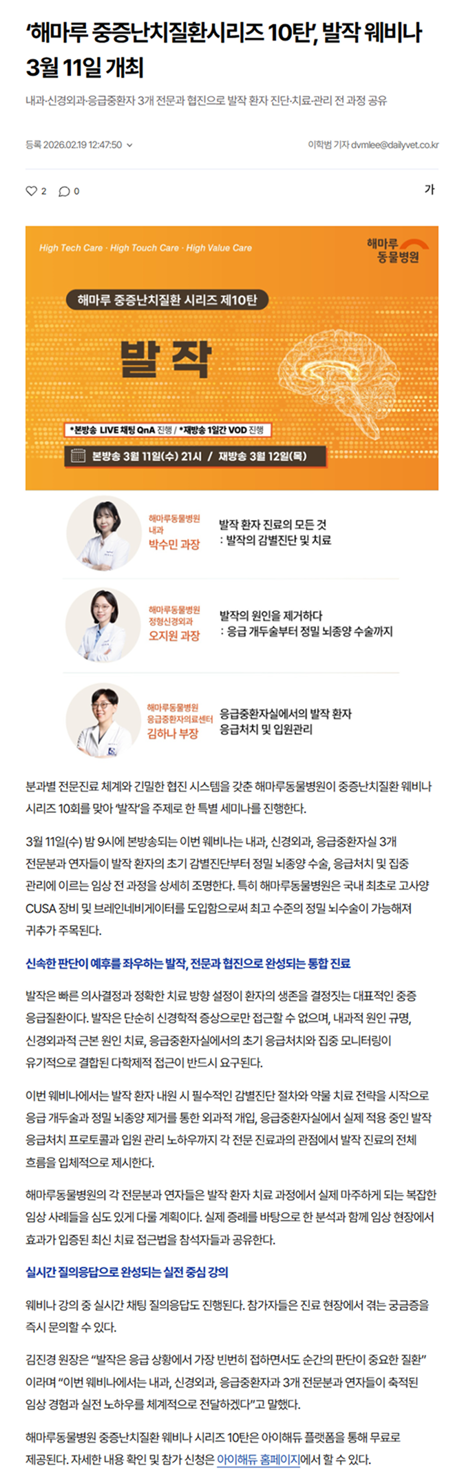 ▶ 기사 출처 : 데일리벳▶ 웨비나 신청 : 아이해듀 목록 PREV [모집] 해마루반려마음센터 '펫로스 증후군 사전 예방 교육' 프로그램 NEXT [공지] 해마루 동물병원 '보호자 주차장' 안내